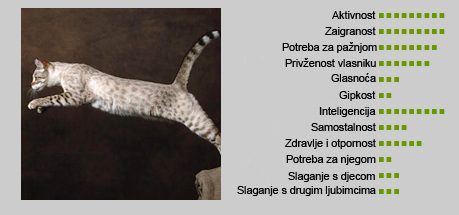 | OPĆENITO: | Cilj uzgoja ove mačke je stvoriti domaću mačku koja ima pouzdan temperament i divlji izgled. |